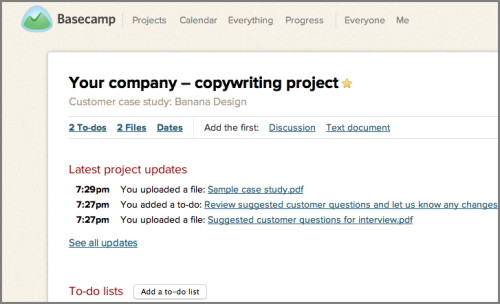 Depending on the nature of our work together, we'll usually invite you to a Basecamp project as a central location in which to share files, allocate tasks, set project milestones and track progress.